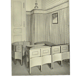 Se observará que la línea recta predomina en las creaciones de muebles del artista. El tipo de mobiliario del dormitorio (fotos 1-3) es muy característico. MOSER utiliza principalmente formas construidas a partir del cuadrado, ya sea en formación puramente cuadrada o rectangular. Superficies lisas y sin divisiones se unen para formar tales proporciones geométricas. Los armarios del dormitorio son arquitectónicamente interesantes por los zócalos muy retranqueados que sirven de base. Mediante esta articulación o separación, el efecto de masa de las construcciones de superficie recta se suaviza muy bien y se transmite la impresión de un desarrollo grácil. Los muebles teñidos en arce gris obtienen la nota ornamental mediante ricas incrustaciones de madera en tonos amarillos y marrón oscuro. El motivo de incrustación a cuadros se extiende uniformemente por todos los muebles. En campos individuales se insertan incrustaciones más ricas, hechas de alpaca y diferentes tipos de madera. En los dos armarios de pared (foto 1), estos campos se convierten en grandes paneles centrales que adornan dos figuras femeninas compuestas de marfil, nácar y maderas preciosas. La flor de lirio de los valles que las adorna se eligió en relación directa con la flor favorita de la dueña de la casa. Esta decoración ya se adentra en los campos de las artes figurativas, ya que las figuras son maravillosas en su pureza, movimiento y expresión.